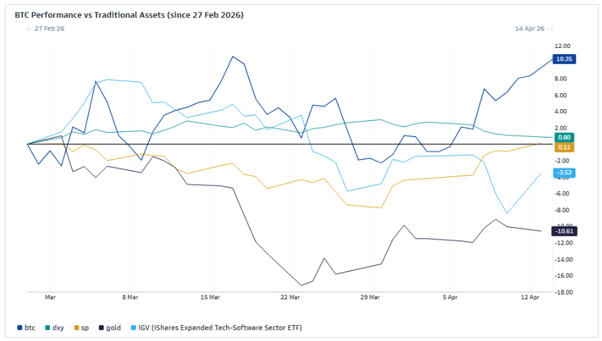 One notable pattern is that BTC’s medium-term return profile tends to converge with software equities, as proxied by IGV. In other words, while BTC can trade like a high-beta geopolitical shock absorber in the short term, over time it has tended to behave more like a growth / software-linked risk asset.